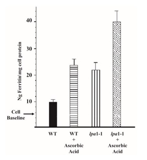 Caco-2 Assay for iron bioavailability from flour produced from maize wild-type (WT) and lpa1-1 isohybrid grain. The lpa1-1 grain contained 66% less phytic acid than WT. Bars indicated standard deviations, n = 3 (data provided by Ray Glahn, USDA-ARS Plant, Soil and Nutrition Lab, Cornell University, Ithaca, NY, USA).