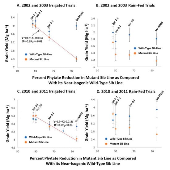 Two rounds of yield trials of barley low phytic acid (lpa) near-isogenic wild-type (normal phytic acid) lines, conducted in 2002 and 2003 and then in 2010 and 2011. Four pairs of near-isogenic lines, each pair consisting of a wild-type (normal phytic acid) sib and a lpa sib, were evaluated in several locations in Idaho (USA). These locations were either irrigated (two locations in 2002/2003 and three locations in 2010/2011) or rain-fed (non-irrigated; two locations in both 2002/2003 and 2010/2011) [27,89]. The homozygous lpa member of each isoline pair are: lpa1-1, which conditions a ~47% reduction in seed phytic acid; lpa2-1, which conditions a ~50% in seed phytic acid; lpa3-1, which conditions a ~65% reduction in seed phytic acid; lpa-M955, which conditions a ~95% reduction in seed phytic acid. (A,B): Trials conducted in 2002 and 2003. (C,D): Trials conducted in 2010 and 2011. The error bars represent the standard deviation of the mean, or standard error, n = 12 to n = 36. Linear regression of yield against % phytate reduction (indicated by red lines) was calculated for the lpa isolines in the irrigated trials.