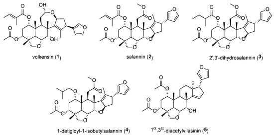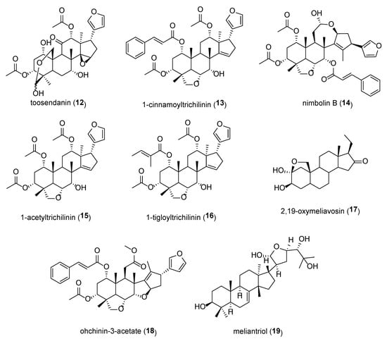 - Rajab, M.S.; Bentley, M.D. Tetranotriterpenes from Melia volkensii. J. Nat. Prod. 1988, 51, 840–844. [Google Scholar] [CrossRef]