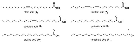 | Unsaturated fatty acids (oleic acid, linoleic acid and gadoleic acid); saturated fatty acids (palmitic acid, stearic acid and arachidic acid) | Seed | Synergistic enhancement of insecticidal activity | [39,40] |