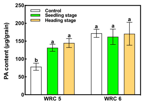 Effect of the time of P fertilizer application on the PA content in WRC 5 and WRC 6. White, green, and orange indicate control, P applied in the seedling stage, and P applied in the heading stage, respectively. Each value represents the mean ± SD of four replicates. Different letters indicate statistical differences (Tukey’s HSD test, p < 0.05).