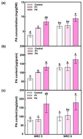 Effect of the amount of P fertilizer on PA accumulation in WRC 5 and WRC 6. (a) PA concentration per gram dry weight (mg/gDW), (b) PA content per grain (μg/grain), (c) PA content per plant (mg/plant). White, pale pink, and pink indicate control, P1 treatment, and P4 treatment, respectively. Each value represents the mean ± SD of four replicates. Different letters indicate statistical differences (Tukey’s HSD test, p < 0.05).