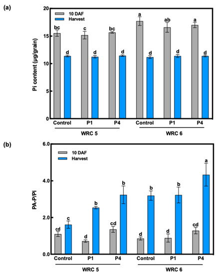 The Pi content and PA-P/Pi ratio at 10 days after flowering (DAF) and at harvest are shown in Figure 3. We found that the Pi content showed no response to P fertilizer treatment (Figure 3a). WRC 6 showed a significantly higher Pi content at 10 DAF than WRC 5. The PA-P/Pi ratio presented no significant difference between P treatments or genotypes at 10 DAF (Figure 3b). The PA-P/Pi ratio at harvest was increased under P4 treatment and was associated with the PA content per grain (Figure 2b and Figure 3b).