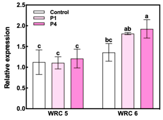 Relative gene expression of INO1 at 10 DAF in WRC 5 and WRC 6. White and pink indicate the control and P treatment, respectively. Each value represents the mean ± SD of three replicates. Different letters indicate statistical differences (Tukey’s HSD test, p < 0.05).
