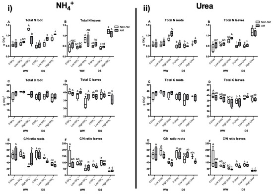The C/N ratio in roots of NH4+-fertilized plants under WW conditions was reduced in non-AM plants receiving high N fertilization, while under DS, the ratio was progressively decreasing when increasing N fertilization level, both in AM and in non-AM plants (Figure 3i(E)). A similar pattern was observed in C/N ratio in roots of urea-treated plants (Figure 3ii(E)). In leaves under WW conditions, the ratio decreased also with high NH4+ application both in non-AM and AM plants. Under DS, the C/N ratio followed a similar trend with NH4+ and urea fertilization. Thus, it decreased in non-AM plants compared to AM plants when plants were not fertilized with N. The ratio increased in both inoculation treatments under low-N fertilization and it decreased in both inoculation treatments under high NH4+ fertilization (Figure 3i(F) and Figure 3ii(F)).