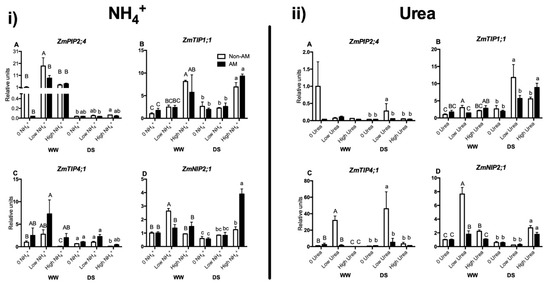 ZmPIP2;4 was up-regulated by low NH4+ level in non-AM plants under well-watered conditions (Figure 5i(A)). In the urea experiment, significant differences were only observed under drought stress conditions, where the gene was also up-regulated in non-AM plants by low urea application (Figure 5ii(A)).