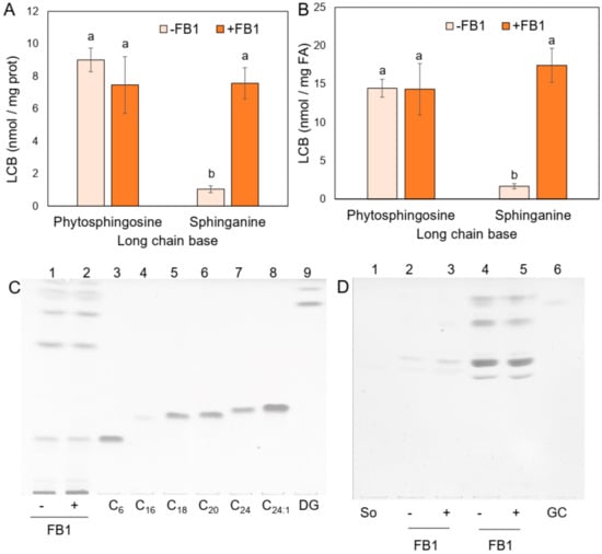 Maize (Zea mays, landrace Chalqueño) embryos were manually dissected from dry seeds, imbibed, and supplemented with FB1 dissolved in H2O or with sphinganine, phytosphingosine, or ceramide dissolved in ethanol and incubated at 29 °C for 24 h as previously described [].
