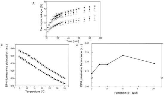 The observed increase of endogenous sphingolipid species in the PM could be affecting the bilayer properties and these changes, in turn, could be contributing to the observed PM H+-ATPase activity inhibition. Therefore, we measured the permeability levels of the maize embryos exposed to FB1 and the fluidity of the PM isolated from FB1-imbibed embryos. Figure 3A shows that 10 and 20 µM FB1 increased more than 2-fold the maize embryos nonspecific electrolyte loss. DPH fluorescence polarization determined as a function of temperature demonstrated that PM fluidity from maize embryos imbibed with FB1 was decreased relative to the control membranes, in the range of temperatures assayed (Figure 3B). We also tested the effect of different FB1 concentrations in the maize embryos imbibition medium on the PM fluidity, determining DPH fluorescence polarization at 30 °C, the same temperature at which ATPase activity was measured. Results in Figure 3C show that membrane fluidity considerably diminished upon FB1 treatment and that the largest effect was with 10 µM FB1. Higher mycotoxin concentrations did not increase fluidity proportionally.