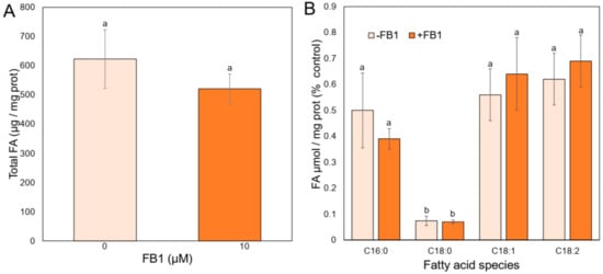 Fatty acids from PM of maize embryos exposed to FB1. Maize embryos were imbibed with 10 µM FB1 for 24 h, their PM fractions isolated, membrane lipids extracted and derivatized to obtain the correspondent methyl esters to be analyzed by gas chromatography. (A) Total fatty acids from PM from control and FB1-imbibed maize embryos. (B) Main fatty acids from control and FB1-imbibed maize embryos. Data are the means ± SD of 3–5 independent experiments. Holm–Sidak t-test was performed using GraphPad Prism version 8.0 for Windows, GraphPad Software (San Diego, CA, USA).