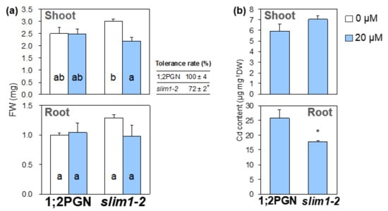 When plants were grown without Cd, the fresh weights of shoots and roots of slim1-2 and 1;2PGN plants were similar. Cd exposure did not affect the root fresh weight in slim1-2 or 1;2PGN. In contrast, the shoot fresh weight of slim1–2 was decreased by Cd treatment, whereas that of 1;2PGN was not affected (Figure 1a). Cd tolerance rates described as Cd20/Cd0 rate of shoots fresh weight were 100% and 72% in 1;2PGN and slim1–2, respectively.