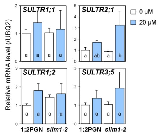 Sulfate uptake from roots is facilitated by SULTR1;1 and SULTR1;2, whose transcript levels are strongly increased by −S in a SLIM1-dependent manner []. Although SULTR1;2 was defined as the main contributor to Cd-induced sulfate uptake in Arabidopsis [], the involvement of SLIM1 in this induction process has not been reported. The transcript levels of two low-affinity sulfate transporter genes, SULTR2;1 and SULTR3;5, which are known to be involved in the root-to-shoot sulfate transport [,,], were increased by Cd exposure and −S [,,,,,], but their −S responses did not depend on SLIM1 [].
