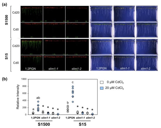 Plants were grown on agar medium supplemented with 1500 or 15 µM sulfate with or without 20 µM CdCl2, and the GFP fluorescence derived from a fusion gene construct, PSULTR1;2-GFP, was visualized and quantified in roots (Figure 5a,b). GFP signals in 1;2PGN roots were increased by reducing the sulfate levels in the medium, whereas those in slim1–1 and slim1–2 were not increased as reported previously []. Cd treatment increased GFP fluorescence in 1;2PGN roots in the presence of sulfate at any concentration, which also did not occur in the slim1 mutants.