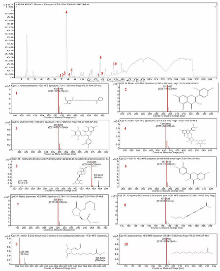 Polyphenolic rich extract was achieved by ultrasonic homogenizer extraction technique using 90% ethanol as a solvent as described. In the current study, the chemical profiling of CSP polyphenolic rich extract was carried out by means of by LC–ESI-Q-TOF–MS; the molecular mass (m/z) and lambda max (λmax) of the chemical compounds were compared with various database, literature survey, and research articles shown in Table 1. According to the identification data, the chemical compounds identified in CSP polyphenolic rich extract were flavonoids mostly flavonol derivatives along with fatty acids derivatives as shown in Figure 1. The most dominating chemical compound present in the CSP extract was rutin.