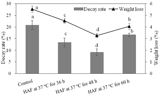 Effect of different HAF treatments on decay percentage and weight loss of navel orange fruit stored at 6 °C for 120 days. Values are the mean ± S.E. (n = 3).