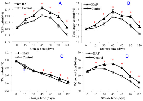 Effects of HAF treatment on the contents of TSS (A), total sugar (B), TA (C), and VC (D) of navel orange fruits during 120 days of cold storage at 6 °C. Each value was presented as the mean ± standard error (SE) of three replicates. The symbols * and * represent significantly higher and lower values, respectively, for the HAF-treated fruits than for the control fruits. The significant difference was determined according to the independent samples t-test (P < 0.05) on each storage day.
