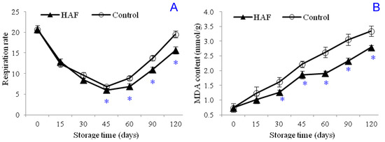Effects of HAF treatment on respiration rate (A) and MDA content (B) of navel orange fruits during 120 days of cold storage at 6 °C. Each value was presented as the mean ± standard error (SE) of three replicates. The symbol * represents significantly lower values for the HAF-treated fruits than for the control fruits. The significant difference was determined according to the independent samples t-test (P < 0.05) on each storage day.