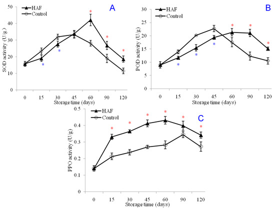 Effects of HAF on enzyme activities of SOD (A), POD (B), and PPO (C) of navel orange fruits during 120 days of cold storage at 6 °C. Each value was presented as the mean ± standard error (SE) of three replicates. The symbols * and * represent significantly higher and lower values, respectively, for the HAF-treated fruits than for the control fruits. The significant difference was determined according to the independent samples t-test (P < 0.05) on each storage day.