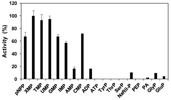- Cabello-Díaz, J.M.; Quiles, F.A.; Lambert, R.; Pineda, M.; Piedras, P. Identification of a novel phosphatase with high affinity for nucleotides monophosphate from common bean (Phaseolus vulgaris). Plant Physiol. Biochem. 2012, 53, 54–60. [Google Scholar] [CrossRef] [PubMed]