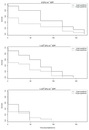 The first objective of statistical analysis was to determine whether application of pyrethrum and EPF would result in lower aphid survival than treatment with EPF alone. Differences between treatment groups were first visualized by plotting Kaplan–Meier survival estimates (Figure 1). A model with Weibull errors was used to test whether there was an interaction between EPF level (0 CFU mL–1, 1 × 106 CFU mL−1 or 1 × 108 CFU mL−1) and presence (10 ppm pyrethrins) or absence (0 ppm) of pyrethrum on aphid survival. The time interval in which the aphid died was entered as the dependent variable. Aphids which did not die during the experiment were recorded as censored cases. Independent effects of EPF level and pyrethrum presence or absence were then tested separately. Differences in survival between individual EPF levels were tested through model simplification (presence vs. absence of EPF, low (1 × 106 CFU mL−1) vs high (1 × 108 CFU mL−1) EPF. Significance of all effects was assessed through χ2 test changes in residual deviance following deletion from the model [46]. All analyses were performed in R [47,48,49].