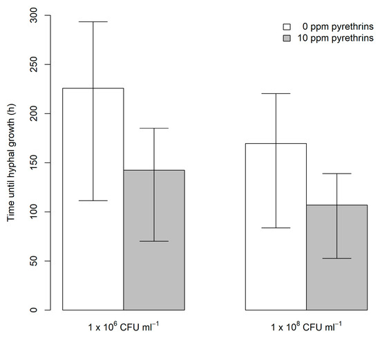 Overall, aphids (n = 40) which had not been treated with EPF (0 CFU mL−1) showed no hyphal growth up to 192 h after treatment. Aphids not treated with EPF were therefore excluded from further analysis of time until visible fungal growth. Increasing concentration of treatment from 1 × 106 CFU mL−1 to 1 × 108 CFU mL−1 significantly reduced time until hyphal growth (χ2 = 10.74, df = 1, p = 0.001). Addition of pyrethrum at 10 ppm pyrethrins also significantly reduced time until hyphae formation was observed (χ2 = 10.74, df = 1, p < 0.001). However, no interaction was found between EPF level and pyrethrum treatment on time until hyphal growth was observed (χ2 = 2.37, df = 1, p = 0.12). Addition of pyrethrum reduced predicted mean time until growth was seen by 84 h at 1 × 106 CFU mL−1 (from 226 h to 142 h) and 63 h at 1 × 108 CFU mL−1 (from 170 h to 107 h) (Figure 2).