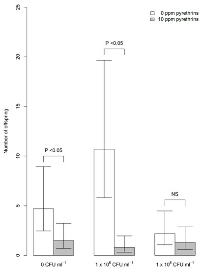 Due to a very low offspring count in the first block of replicates, only aphids tested in the second block of treatments were used in the analysis. In this block, a significant interaction was found between EPF level (0 CFU mL−1 (carrier oil only), 1 × 106 CFU mL−1 or 1 × 108 CFU mL−1) and pyrethrum presence (10 ppm pyrethrins) or absence (0 ppm) on total number of offspring produced by each aphid (χ2 = 7.01, df = 2, p = 0.03). At 0 CFU mL−1 and 1 × 106 CFU mL−1, addition of pyrethrum resulted in significantly fewer offspring produced (Tukey’s test, p < 0.05, Figure 3). However, no significant effect of pyrethrum was found on number of offspring produced by aphids exposed to 1 × 108 CFU mL−1 of EPF.