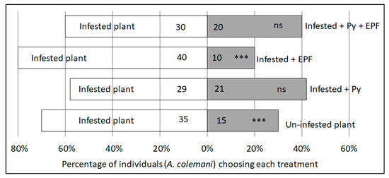 Parasitoid, A. colemani, responses to treatments in a Y-tube olfactometer. N = 50 for each treatment, with the number of individuals choosing each side indicated on the relevant bar. Where ‘Infested’ refers to aphid colonized plant, Py is treatment with pyrethrum and EPF is treatment with entomopathogenic fungi, Metarhizium anisopliae (ICIPE 62) *** Indicates p < 0.01, ns = not significant.