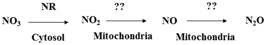 It is evident that the mitochondrion is a site of NO2 reduction [30,37]. NO2 in the mitochondria is reduced to NO, and the process is pronounced under hypoxic to anoxic stress [30,38,39] and is more favorable at a lower pH [40,41]. Accordingly, Klepper (1987) [42] and Rockel et al. (2002) [43] reported a high emission of NO from plant leaves after the supply of NO3 under anaerobic conditions. The reduction process in the mitochondria is catalyzed by various electron transport chains (ECTs) [39,44]. For example, complex III [45] (Benamar et al., 2008), cytochrome c [44,46], and alternative oxidase (AOX) [47] can catalyze the reduction of NO2 to NO in the mitochondria. The NO subsequently formed is further reduced to N2O by a reduced form of eukaryotic cytochrome c oxidase [26,48]. The conversion of NO into N2O by a reduced form of cytochrome c oxidase is more favorable at low levels of both NO and O2 [48]. Cytochrome c oxidase in aerobic organisms is considered to be evolved from bacterial denitrifying enzymes [49]. Therefore, it is believed that, under the condition of less oxygen in cells, the enzyme exhibits some rudimentary nitrite and nitric oxide reductase activities [26,48,50]. Moreover, quinone in the mitochondria can also catalyze the reduction of NO to N2O [51,52,53].