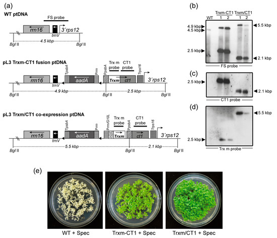 Chloroplast transformation was achieved through bombardment of gold microprojectiles coated with the previously described vectors into in vitro-grown Petite Havana tobacco leaves as previously described [37]. The leaves were placed in a regeneration medium that included spectinomycin as a selection agent. Shoots regenerated from these leaves were subjected to several rounds of selection under the same conditions in order to obtain homoplasmic plants for both fusion and co-expression transformed genotypes (hereafter referred to as Trxm-CT1 and Trxm/CT1, respectively). Successful transformation of the plastid genome and correct site-specific integration of the transgenes by homologous recombination between the rrn16/trnV and 3′rps12 genes were assessed by Southern blot analysis. The DNA from regenerated and untransformed (WT) plants was digested with the BglII restriction enzyme, which cuts two positions flanking the insertion site outside the left and right recombination regions and one position in the psbA promoter (Figure 1a). The FS probe, which is homologous to the flanking regions rrn16/trnV and 3′rps12, identified a 4.5-kbp fragment in the WT plant, 4.9- and 2.5-kbp fragments in plants expressing the Trxm-CT1 fusion, and 5.5- and 2.1-kbp fragments in plants co-expressing Trx m and CT1 (Figure 1b). Two independently transplastomic lines per construct are shown. The absence of a 4.5-kbp fragment in transgenic genotypes indicates homoplasmy (Figure 1b). However, line 2 of the Trxm/CT1 genotype showed a slight 4.5-kbp fragment that would indicate heteroplasmy. Therefore, this line was discarded and line 1 was used to carry out the following experiments. When the blot was stripped and reprobed with gene-specific probes, the expected hybridization pattern was observed in all the transplastomic genotypes for both CT1 (Figure 1c) and Trx m probes (Figure 1d). As expected, CT1-specific hybridization was absent in the WT plants (Figure 1c), but Trx m-specific hybridization was also not visible. Although Trxm is an endogenous tobacco gene, the nuclear DNA levels were likely below the detection limit of the labeling system used. To ultimately confirm homoplasmy, seeds from the T0 generation were germinated in vitro on a spectinomycin-selective medium. A lack of segregation for spectinomycin resistance in the T1 generation demonstrated homoplasmy (Figure 1e).