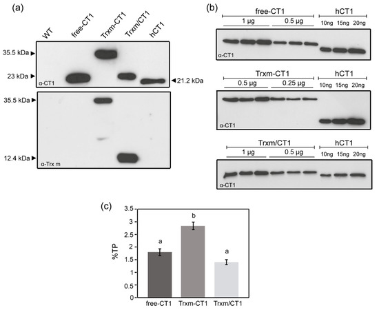 To determine the accumulation of CT1 protein in chloroplasts, plants from the T1 generation of homoplasmic fusion and co-expression genotypes were analyzed using the previously generated CT1 expressing plants as control [14] (hereinafter referred as free-CT1). Total protein (TP) from young leaves was extracted and analyzed by Western blot using a specific CT1 antibody (Figure 2a, upper blot). For all genotypes, the antibody recognized a specific protein of the expected molecular mass, but no immunoreactive polypeptide was present in the WT plant extracts, indicating that the detected signal was specific for CT1. Monomers of CT1 were detected at approximately 23 kDa in free-CT1 and Trxm/CT1 co-expressing genotypes, which were slightly larger than the size of commercial human CT1 (21.2 kDa) as a result of the polyhistidine tag. Likewise, monomers corresponding to the Trxm-CT1 fusion protein (35.5 kDa) were also detected. The extracted protein was also analyzed by Western blot with specific Trx m antibody (Figure 2a, lower blot). Monomers of both Trx m (12.4 kDa) and Trxm-CT1 (35.5 kDa) were detected in the co-expressing and fusion genotypes, respectively. In this blot, endogenous Trx m was undetectable in WT plants due to its low expression level compared to transplastomic genotypes.