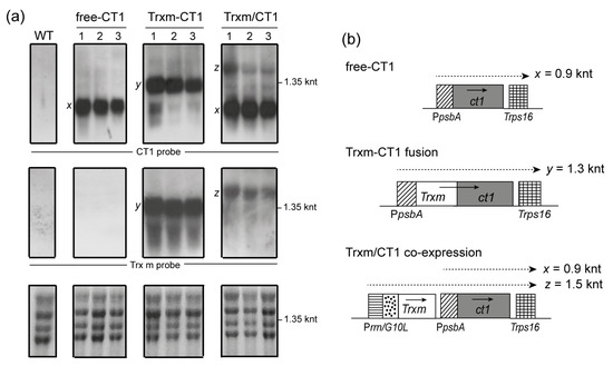 The blot was stripped and hybridized against a Trx m-specific probe (Figure 3a, middle panels). As expected, no transcripts of the endogenous Trxm gene were detected in WT and free-CT1 tobacco genotypes as a consequence of its low expression level (under the detection limit of the labeling system). Trxm-CT1 fusion plants accumulated high levels of Trxm monocistronic transcripts (1.3 knt, y) and confirmed the hybridization pattern seen above for the CT1 probe. However, only Trxm/ct1 dicistronic transcripts (1.5 knt, z) were observed in Trxm/CT1 co-expressing plants, which is likely due to the absence of a terminator after the Trxm sequence (Figure 3b).