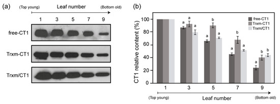 CT1 protein accumulation in tobacco chloroplasts as a function of leaf age. (a) Comparison of CT1 accumulation in a developmental series of five alternating leaf samples from the top to the bottom of the plant. Representative Western blots are shown. For each genotype, 2 µg of total protein were loaded. (b) CT1 densitometric quantification of tobacco leaves in different developmental stages. Leaves are numbered from the top (youngest) to the bottom (oldest) of the plant: 1, 3, 5, 7, and 9. Results are the mean ± SE of two measurements for three independent transgenic plants per construct. For each leaf, different letters indicate significant differences (t-test, p ≤ 0.05). Free-CT1: free-CT1 expressing plants; Trxm-CT1: fusion plants; Trxm/CT1: co-expression plants.