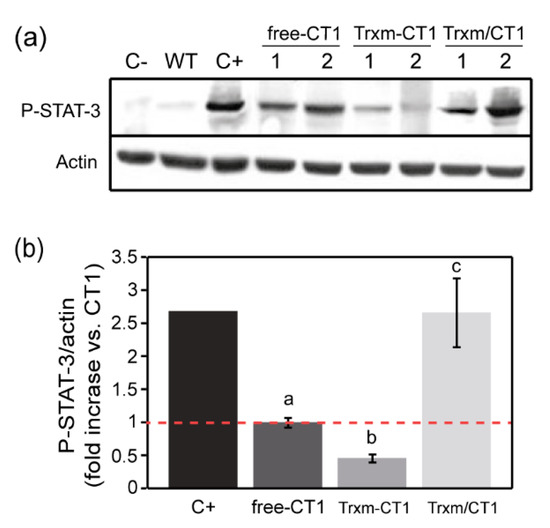 The impaired functionality of Trxm-CT1 fusion protein produced in tobacco leaves may be due to incorrect protein folding caused by Trx m fusion at the amino terminus of CT1. Indeed, the disulfide reductase activity of the Trx m fused to CT1 was also damaged (Figure 6), as demonstrated by the insulin reduction assay [38]. Similarly, the foldase activity of Trx m in the fusion protein could also be affected. It is known that the presence of affinity tags may affect important characteristics or functions of the protein of interest [62] and may interfere with protein activity [63]. Alterations in protein properties, structure and specific activity have been reported for fusion proteins relative to the native form [64,65,66]. In our case, both oxidoreductase activity and STAT-3 phosphorylase induction were impaired, suggesting that unfavorable interactions during folding of the fusion protein were responsible for this misfolding, as described previously [66]. To alleviate such structural disturbance, a GPGP linker has been inserted between Trx m and CT1 proteins [34,67]. However, in the present work, such a linker was not sufficient to separate both proteins effectively. Thus, linkers with different lengths or different conformations could be assessed in future works [66]. Alternatively, the introduction of a recognition sequence for a chemical agent or a protease between the fusion partner and the target protein would allow for site-specific cleavage of the fusion protein to remove the affinity fusion partner [68,69]. Generally, the fusion protein would be refolded properly and would recover its bioactivity when the tag was cleaved off [64]. However, this always introduces additional challenges into the downstream processing.