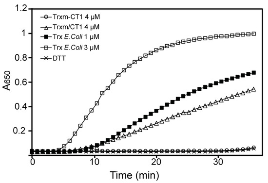 The disulfide oxidoreductase activity of the His-tagged Trxm-CT1 or Trxm/CT1 proteins was determined according to the DTT-dependent insulin reduction assay [38]. Reactions were assayed at 25 °C and initiated by adding 0.5 mM DTT to the reaction mixture, which contained 100 mM Tris-HCl (pH 7.5), 2 mM EDTA, 1 mg/mL insulin (Sigma-Aldrich, St. Louis, MO, USA), and 4 µM of purified Trxm-CT1 or Trxm/CT1 proteins. Trx from E. coli (Sigma-Aldrich) was used at 1 and 3 µM as positive control. An assay in the absence of Trx was used as negative control. The oxidoreductase activity was determined by monitoring the increase in turbidity at 650 nm using a microplate reader (Multiskan Ex, Labsystems, Helsinki, Finland).