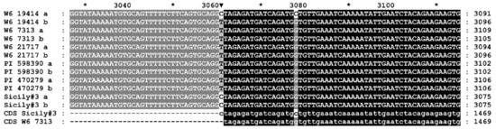 In total, 109 single-nucleotide polymorphisms, referring to 11 different alleles, were found in the protein-coding sequence of the gene (Supplementary File 2). Two sister alleles of the Sicilian accession of D. villosum (Sicyly#3), provided by A.J. Lukaszewski, were found to be identical in terms of protein-coding sequence. A total of 47 of the 109 polymorphisms led to predictable changes in the amino acid sequence. Analysis of amino acid substitutions using the PROVEAN online service showed that three of them are significant for the functioning of the protein (score less than –2.5). These are substitutions of D717A, S742F and E848V, caused by the single-nucleotide variants A2150C, C2225T and A2543T, respectively (coordinates are indicated in the protein-coding sequence). However, these three mutations were rare and were found only in one of the accessions, W6 19414, PI 470279 or PI 598390, respectively, in a heterozygous state. Other amino acid substitutions were characterized as neutral.