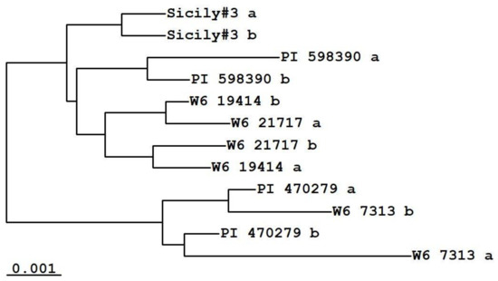 The phylogram based on the first intron of the D53 gene in various accessions of D. villosum. Distances are calculated using the Tajima and Nei model [11]. The letters a and b denote two alleles of each plant.