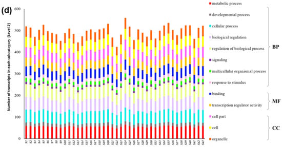 - Haas, B.J.; Papanicolaou, A.; Yassour, M.; Grabherr, M.; Blood, P.D.; Bowden, J.; Couger, M.B.; Eccles, D.; Li, B.; Lieber, M.; et al. De novo transcript sequence reconstruction from RNA-seq using the Trinity platform for reference generation and analysis. Nat. Protoc. 2013, 8, 1494. [Google Scholar] [CrossRef] [PubMed]