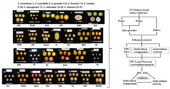 China is one of the important origin centers of the genus Citrus L. with abundant cultivated and wild genotypes resources [18,19]. The Citrus genus has four basic species: Citrus reticulata Blanco (mandarin), Citrus medica L. (citron), Citrus maxima Burm. Merr (pummelo), and Citrus micrantha Wester (papeda), and secondary species: Citrus sinensis (L.) Osb. (sweet orange), Citrus aurantifolia L. (lime), Citrus aurantium L. (sour orange), Citrus limon (L.) Burm (lemon), and Citrus paradisi Macf (grapefruit) [20,21,22]. In recent years, Citrus reticulata has been described extensively in the literature [23]. However, Citrus ichangensis and Citrus limonia have been scarcely studied. Previous studies showed that the flavonoid types and contents in citrus fruits varied due to different species and cultivars [6], and their distribution in different fruits tissues [24]. Naringin was the dominant compound in the peel of pummelo (C. grandis), while mandarin (C. reticulata) was rich in hesperidin [25,26,27]. Grapefruits (Cocktail and Rio Red,) were more precious than the pummelo in flavonoids, and the contents of flavonoids in Cocktail (C. paradisi) peel was significantly higher than in its pulp. In contrast, the Changshanhuyou (C. paradisi) pulp was rich in nobiletin and tangeretin than the peel [25]. Considering these factors, citrus cultivars selected in our study was to analyze the flavonoids content, and composition of peels, pulps, and juices in 27 Chinese local citrus cultivars by UPLC-PDA, and their antioxidant capacities were evaluated (Figure 1). The principle component analysis (PCA) and Pearson correlation were applied to explore the relationship between flavonoid compounds and antioxidant capacity in different fruit tissues or different Citrus species. Our study contributes to finding new sources of active ingredients and lay the foundation for future utilization of local Citrus germplasm.