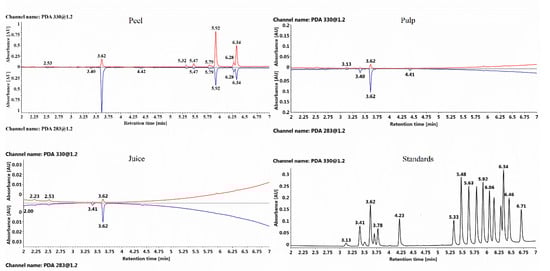 Characteristic UPLC-PDA chromatogram of YXWL (C. reticulata) peel, pulp, juice, and 18 flavonoid standards. Red lines and blue lines mean the chromatogram at the wavelengths of 330 nm and 283 nm, respectively. Retention time and corresponding compounds are listed as: 3.13 min, eriocitrin; 3.41 min, narirutin; 3.51 min, naringin; 3.62 min, hesperidin; 3.70 min, neohesperidin; 3.78, diosmin; 4.23 min, didymin; 5.33 min, isosinensetin; 5.48 min, sinensetin; 5.63 min, 5,7,3′,4′-tetrathoxyflavone; 5.79 min, 5,6,7,4′-tetrathoxyflavone; 5.92 min, nobiletin; 6.06 min, 3,5,6,7,8,3′,4′-hetamethoxyflavone; 6.15 min, 5,7,4′-trimethoxyflavone; 6.29 min, 5-hydroxy-6,7,8,3′,4′-pentamethoxyflavone; 6.34 min, tangeretin. 6.46, Gardenin A; 6.71 min, Gardenin B.