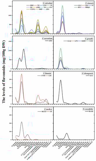 Flavanones, including hesperetin, naringenin, and their respective glycosides, are in the majority of flavonoids in Citrus species [36]. Previous result showed that sweet orange, Chinese wild mandarin, and lime were characterized by the highest level of hesperidin [30,36]. These studies were in line with our results that hesperidin was the principal flavanone in mandarin, lime, and sweet orange. Naringin and neohesperidin are rich in sour orange [37], and they are also the predominant flavanones in grapefruit. In the current study, local cultivar ZPG (C. reticulata), which might originate from interspecific hybridization between C. sinensis and C. reticulata [38], was characterized by neohesperidin and naringin. However, flavonoids are highly similar in the peels of JJSC (C. aurantium) and JPG (C. reticulata), which may correlate with high chemotype similarities between hybrids and their ascendants [39]. This result provides a new insight to Citrus classification and need further discussion on hybridization and genetic change. Pummelo (C. grandis) had a distinct flavanone characterization compared with grapefruit, was characterized by naringin [25,40], and our study also confirmed this result. Kumquat has four major genetic types, including Fortunella japonica, Fortunella margarita, Fortunella crassifolia, and Fortunella hindsii, and are rich in narirutin, hesperidin, and quercetin [41]. In our study, diosmin was the predominant flavone in Fortunella crassifolia. These results revealed Citrus species present their unique flavonoids profile.