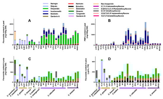 Flavonoids profile of different fruit parts from 27 citrus cultivars. (A) Flavonoids composition of peel. (B) PMFs of peel. (C) Flavonoids composition of pulp. (D) Flavonoids composition of juice.