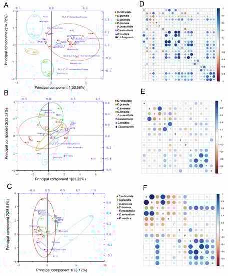 Biplot and Pearson correlation matrix for results obtained from peels (A,D), pulps (B,E), and juices (C,F) of 27 citrus cultivars. Different colored circle represented different citrus species (A–C). Figure inside letters are listed as: a-eriocitrin, b-narirutin, c-naringin, d-hesperidin, e-neohesperidin, f-diosmin, g-didymin, h-isosinensetin, i-sinensetin, j-5,7,3′,4′-tetramethoxyflavone, k-5,6,7,4′-tetramethoxyflavone, l-Nobiletin, m-3,5,6,7,8,3′,4′-heptamethoxyflavone, n-5,7,4′-trimethoxyflavone, o-5-hydroxy-6,7,8,3′,4′-pentamethoxyflavone, p-Tangeretin, q-gardenin A, r-gardenin B, s-ABTS, t-DPPH, u-FRAP, v-TPC, and w-TFC (D–F).