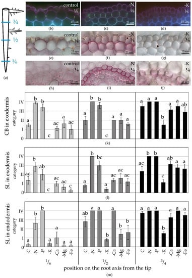 Namyslov, J.; Bauriedlová, Z.; Janoušková, J.; Soukup, A.; Tylová, E. Exodermis and Endodermis Respond to Nutrient Deficiency in Nutrient-Specific and Localized Manner. Plants 2020, 9, 201. https://doi.org/10.3390/plants9020201
