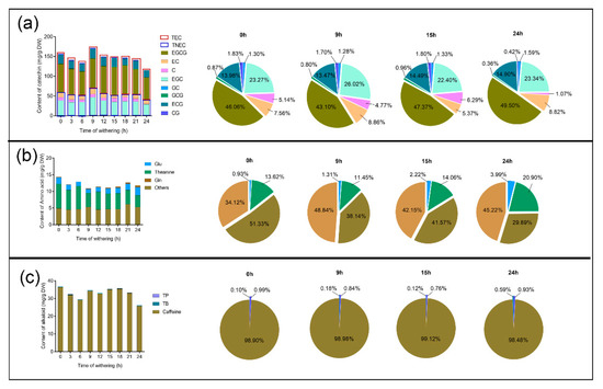 Changes in the content and proportion of catechins (a), theanine (b), and caffeine (c) at different stages of the withering process. The total height of each column and the total area of each pie chart both indicate the total amount of 8 catechins, all amino acids, including theanine, and all alkaloids, including caffeine. C, catechin; CG, catechin gallate; EC, epicatechin; ECG, epicatechin gallate; EGC, epigallocatechin; GC, gallocatechin; GCG, gallocatechin gallate; ECGC, epigallocatechin gallate; TEC, total content of ester catechins; TNEC, total content of non-ester catechins; Glu, glutamate; Gln, glutamine; TB, theobromine; TP, theophylline.