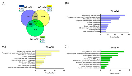 The numbers of differentially expressed genes (DEGs) and significantly enriched Kyoto Encyclopedia of Genes and Genomes (KEGG) pathways. (a) Venn diagram showing the share and specific DEG numbers in different combinations, displayed in the overlapping and non-overlapping regions, respectively. The total numbers of DEGs in W2 vs. W1 (blue circle), W3 vs. W1 (yellow circle), and W4 vs. W1 (green circle) are shown in the first line of the box, including the numbers of upregulated (upward red arrow) and downregulated (downward green arrow) DEGs. Histogram showing the top 10 (ranked by gene number) enriched KEGG pathways in W2 vs. W1 (b), W3 vs. W1 (c), and W4 vs. W1 (d).