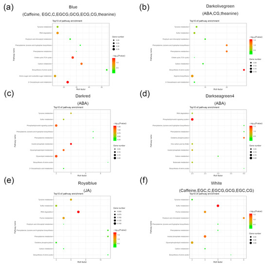 Bubble chart shows the top 10 (ranked by gene number) KEGG pathways in six modules ((a): Blue module, (b): Darkolivegreen module, (c): Daekred module, (d): Darkseagreen4 module, (e): Royalblue module, (f): White module) associated with caffeine and catechins. The X-axis indicates the “rich factor”, represented by the ratio of co-expressed gene numbers to the total gene numbers of each pathway, and the left Y-axis represents the KEGG pathways. Low p values are shown in red, and high p values are shown in green on the right. The area in the circle represents the co-expressed gene number.