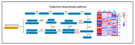 Effect of withering on the catechin biosynthesis pathway in tea leaves. A simplified model of the catechin biosynthesis pathway in tea plants (left) and a heat map, showing the expression pattern of related DEGs based on the Z-core value at different timepoints during the withering process. The DEGs were strictly filtrated by |log2 (fold change)| ≥ 2 and p value < 0.05, with at least one of three comparisons (W2 vs. W1, W3 vs. W1, and W4 vs. W1). Blue represents a low expression level, and red represents a high expression level.
