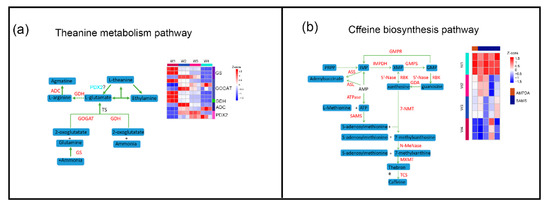 Caffeine, a vital metabolite for tea quality, is used to energize and promote briskness. Previous reports have shown that caffeine synthesis is independent of cacao and coffee lineages, which may be true in tea [29]. In addition, a S-adenosylmethionine synthetase (SAMS) and four AMP deaminases (AMPDAs) were significantly downregulated at the W4 stage (Figure 6b), which was similar to the trend for caffeine content.
