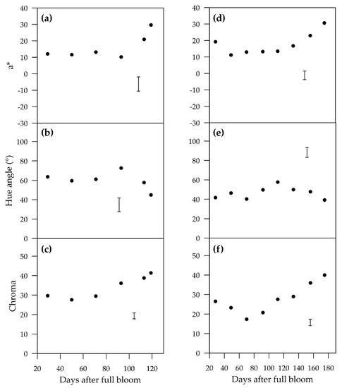 15] showed increasing red colour. “Forelle” and “Red Bartlett” have increasing hue angles throughout the growing season, whereas “Rosemarie” displays a highly variable hue angle in response to temperature. Since sunlight exposure and fruit peel surface temperature are linked in the field, more investigation of their combined effects on pear blush would be beneficial. The harvest hue angles for “ANP-0118” (119 DAFB) and “ANP-0131” (175 DAFB) were closer to a value of “0” (red) than those of “Rogue Red” (159 DAFB) and “Cascade” (135 DAFB), but less red than Red Clapp (124 DAFB) as stated by Dussi [