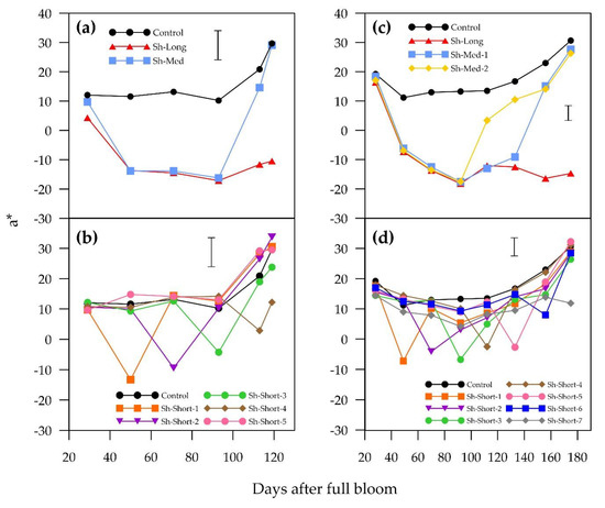 Sunlight exposure was a clear requirement for red colour development in the blush pears “ANP-0118” and “ANP-0131”. Fruit that were shaded for three weeks or longer either completely lost or lost a substantial amount of previously developed red colour. “ANP-0118” and “ANP-0131” fruits that were shaded for the entire experiment (Sh-Long) did not develop an a* value above zero (a* < 0 indicates green). A short shading period (six days) of “ANP-0118” fruits (Sh-Short-5) at the end of the season stalled colour development but did not result in loss of red colour.