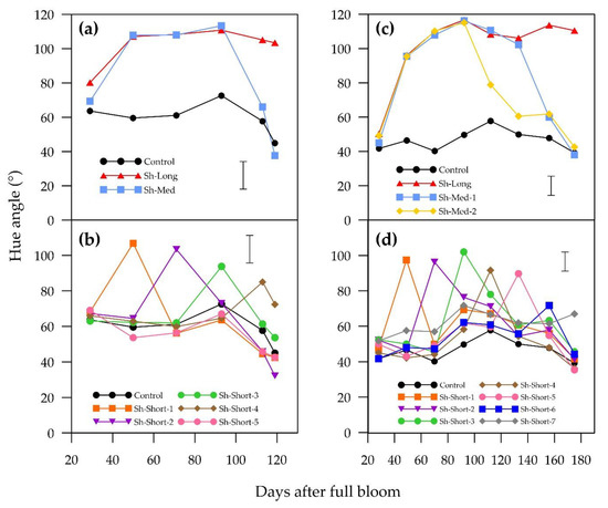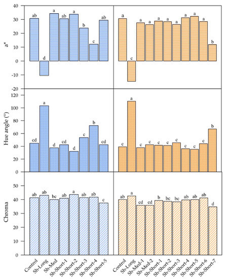 17] reported a change in the composition of soluble sugars was observed, which was not explored in our study. “ANP-0131” fruits responded differently in that the fruit shaded in the three weeks immediately prior to harvest (Sh-Short-7) had the lowest SSC; however, there was no obvious pattern among the other values to explain the differences.